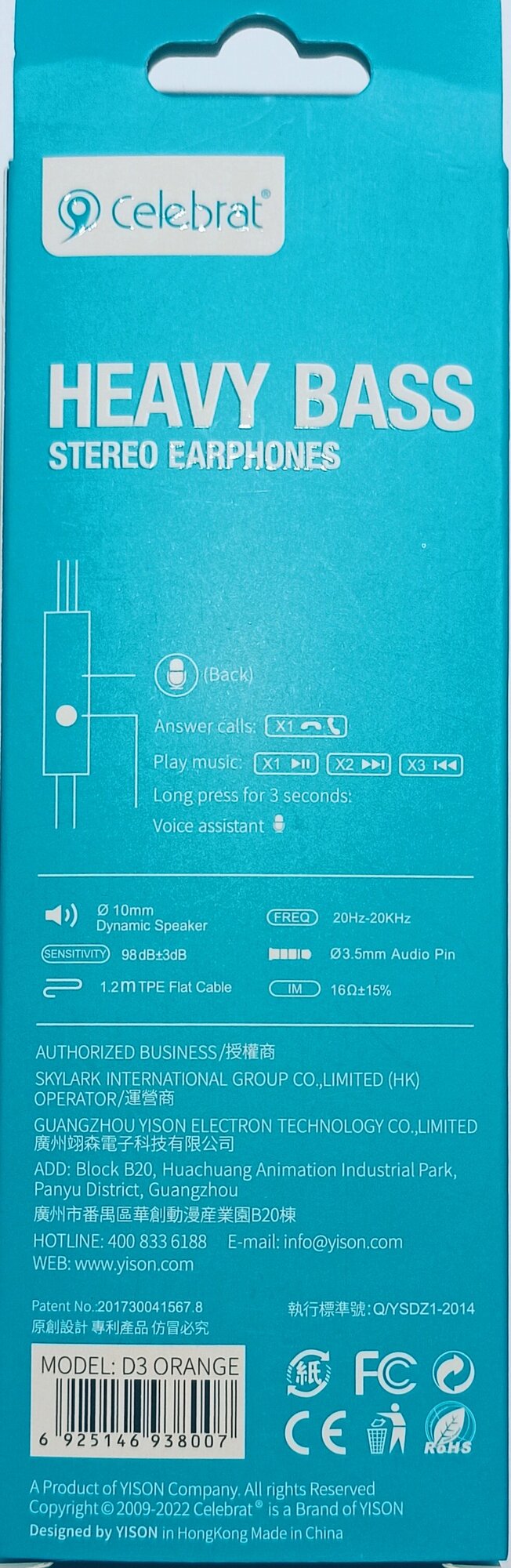 Наушники YISON CELEBRAT D3 проводные, вакуумные, 1,2м, оранжевые