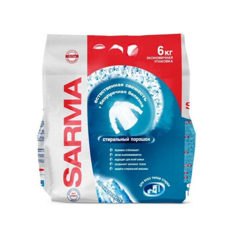 Порошок стиральный SARMA для белого и светлого белья аромат горная свежесть для всех типов стирки 6кг / моющее средство