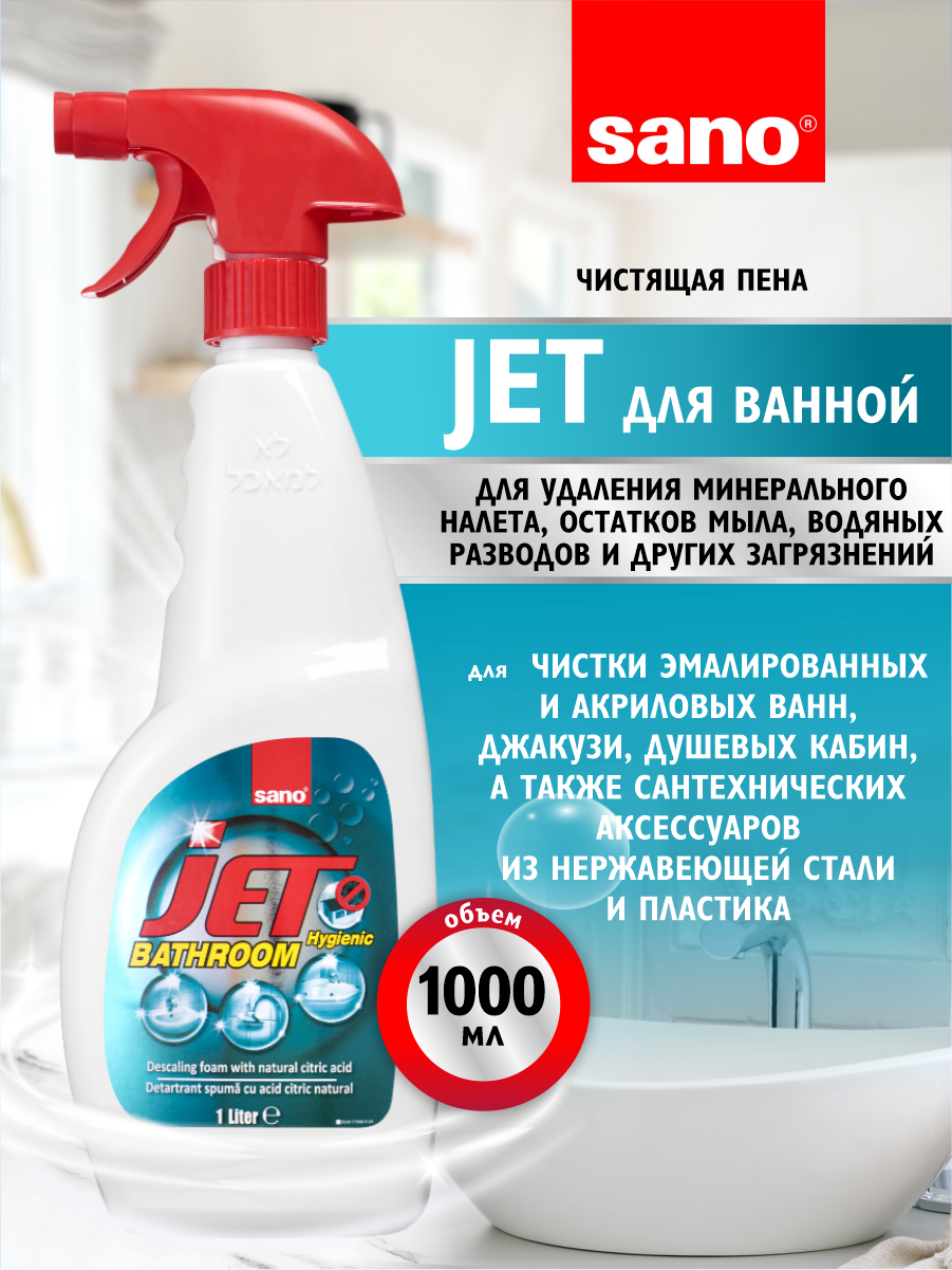 SANO Jet Универсальная пена для чистки ванной комнаты и акриловых ванн 1 л с распылителем