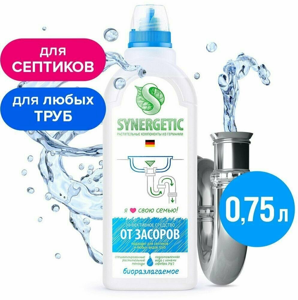 Средство от засоров SYNERGETIC концентрированное, с дезинфицирующим эффектом, без запаха, 0,75л