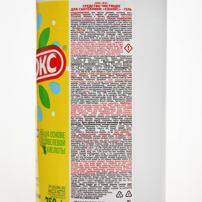 Со временем, конечно, стал послабее, но в целом так же хорош, как и был. Основной ударный элемент - щавелевая кислота. Всё остальное - добавки и отдушки. Работать с этим средством лучше в перчатках! Средство "Санокс гель" пригодно для чистки и санации сантехники. |