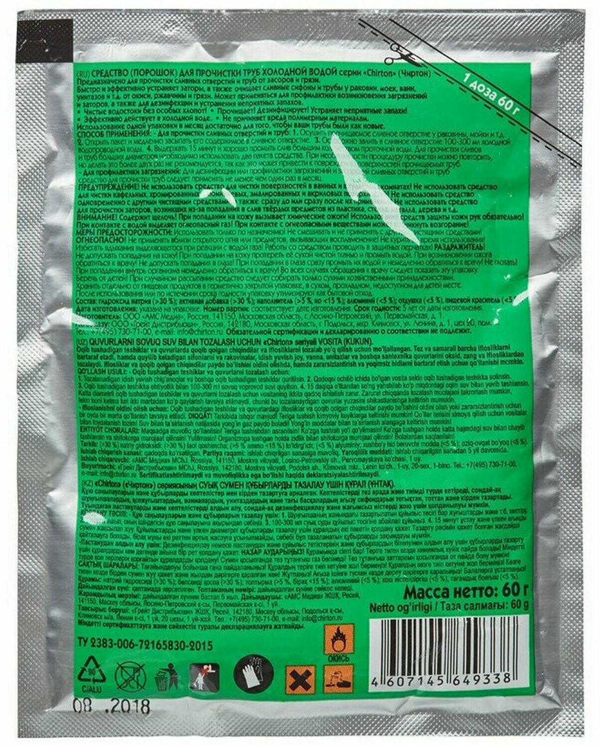 CHIRTON Средство для прочистки сливных труб холодной водой ( порошок в гранулах) 60 г