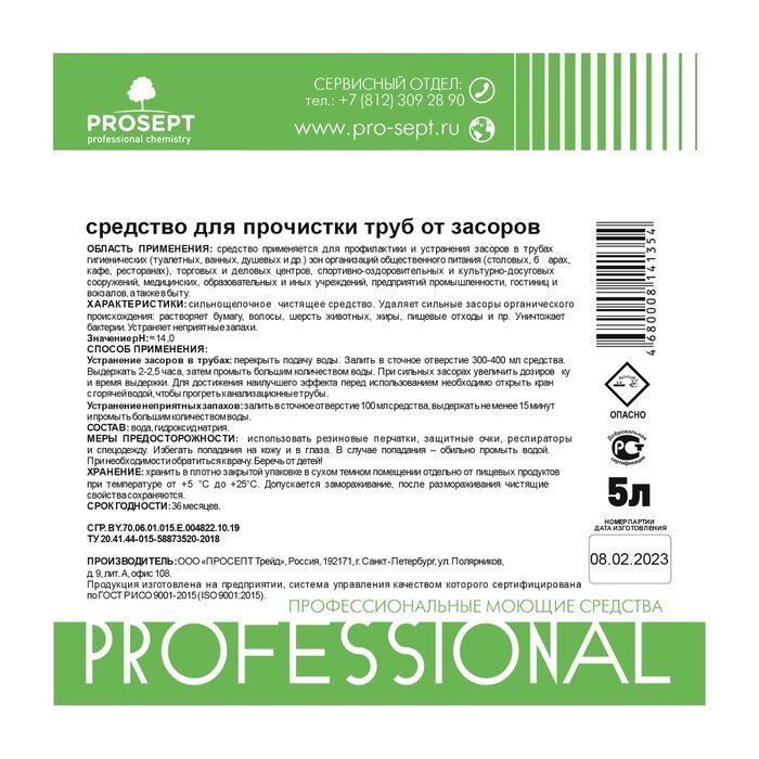 Средство для прочистки труб от засоров PROSEPT Bath Prof, 5 л.