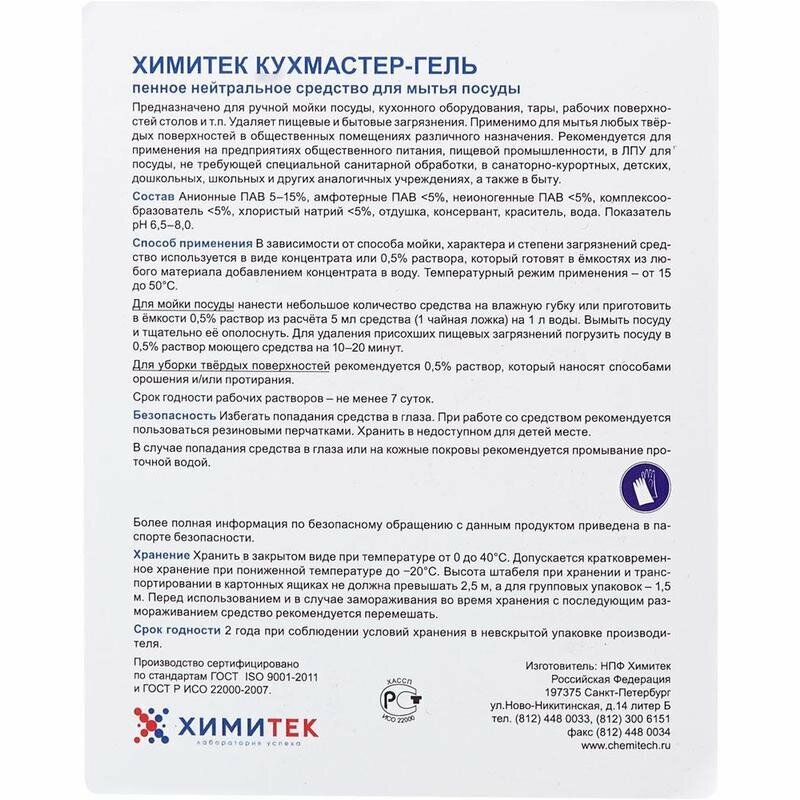 Профессиональное моющее средство для посуды химитек кухмастер-гель 1л