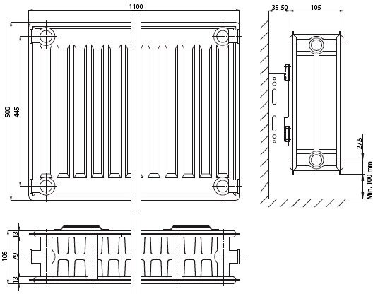 Радиатор, ERK 22, 100*500*1100, RAL 9016 (белый) Elsen