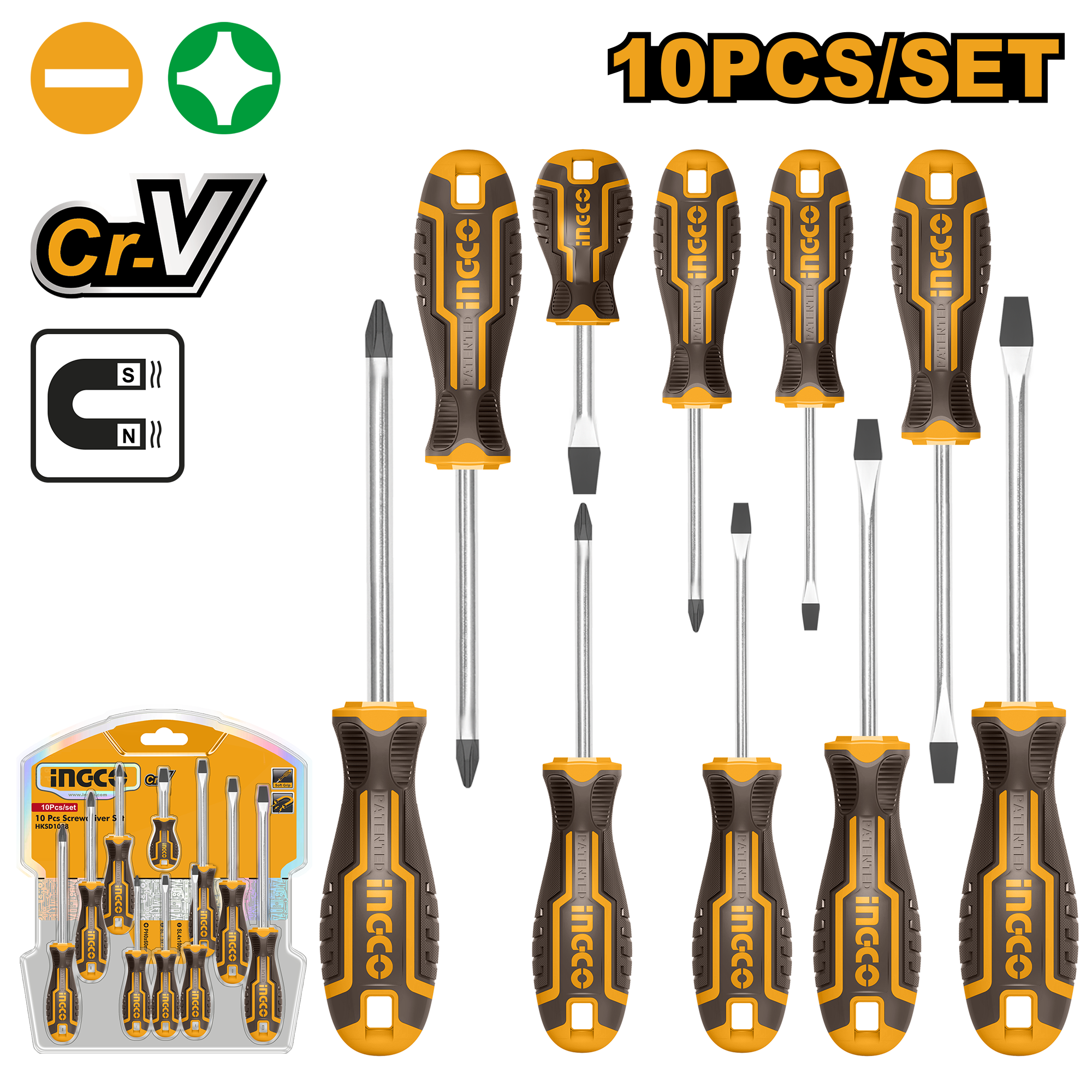 Набор отверток (10шт; Cr-V) магнитный наконечник INGCO INDUSTRIAL HKSD1028