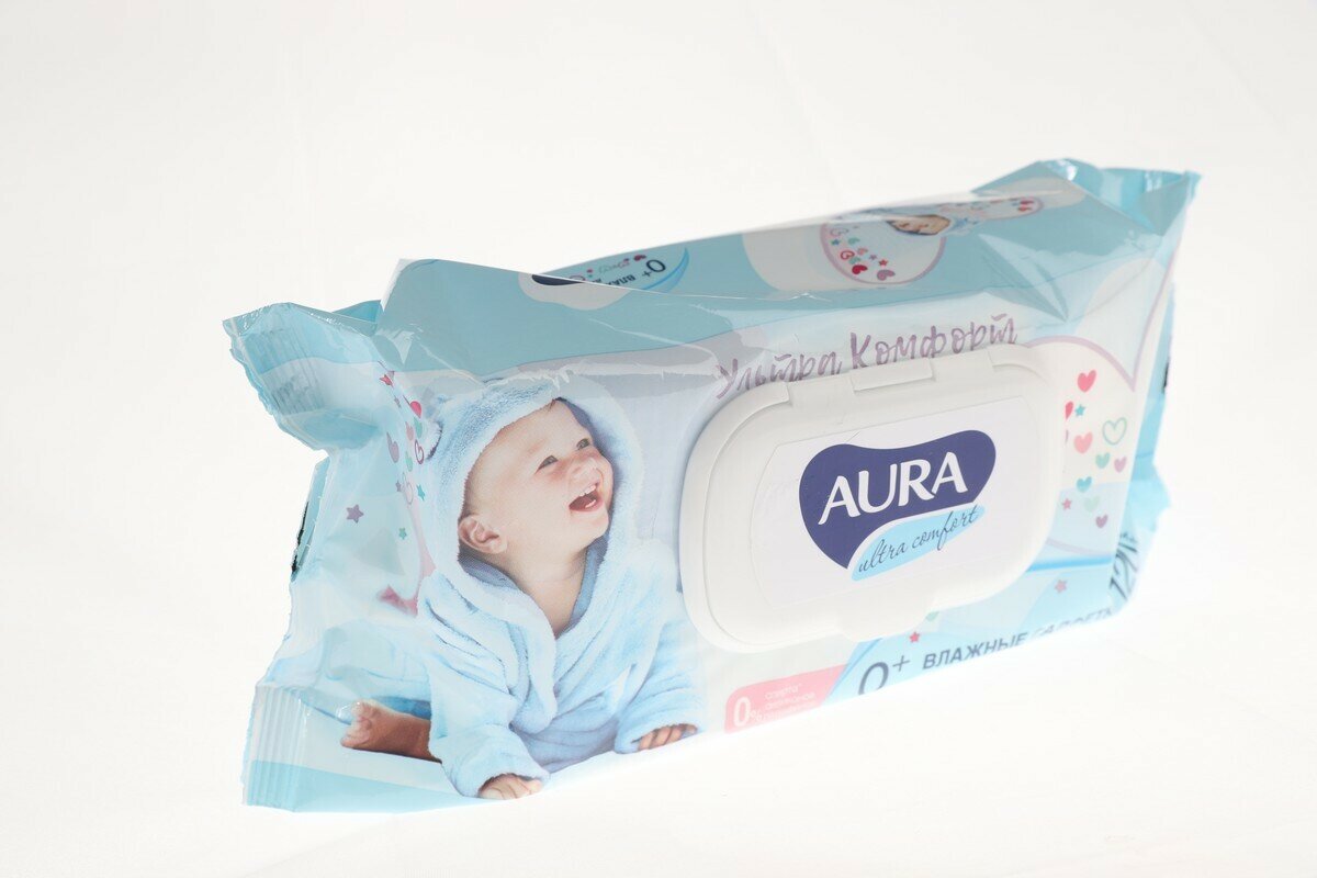 Купить AURA Ultra Comfort Влажные салфетки детские с экстрактом алоэ и витамином Е с крышкой 0+ 120 шт