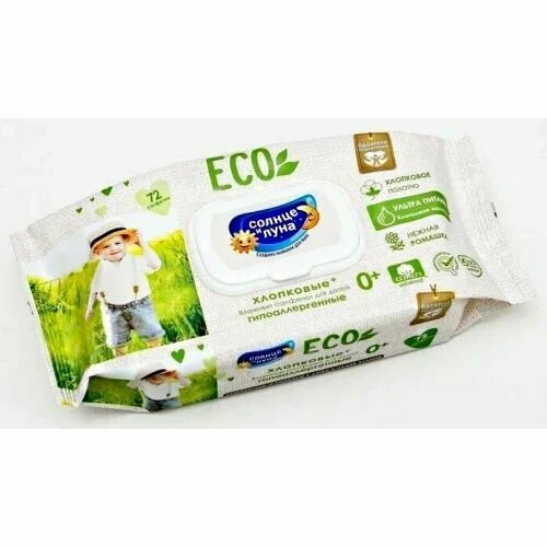 Солнце И луна ECO Влажные салфетки детские 0+ хлопковые нежная ромашка и хлопковое молочко big-pack с крышкой 72шт