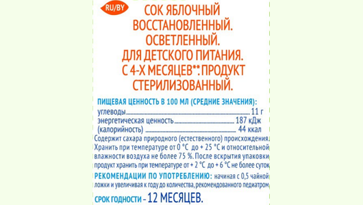 Натуральный, без добавления сахара Недостатки: Для ребёнка он оказался кисловат. Пил и морщился, так и не допил этот сок. Хотя яблочные соки других брендов пьёт с огромным удовольствием |