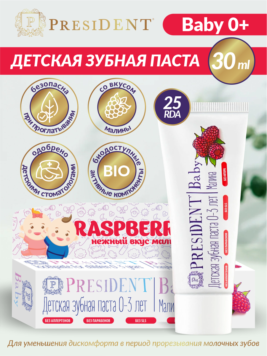 Зубная паста PRESIDENT Детская "Малина" 0-3 лет, 30 мл