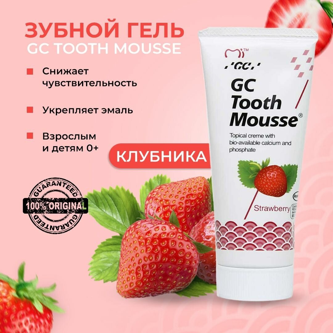 Tooth Mousse клубника, Тус Мусс гель для зубов, для восстановления и укрепления эмали, защиты от кариеса для детей и взрослых, туба 40 г, (GC)