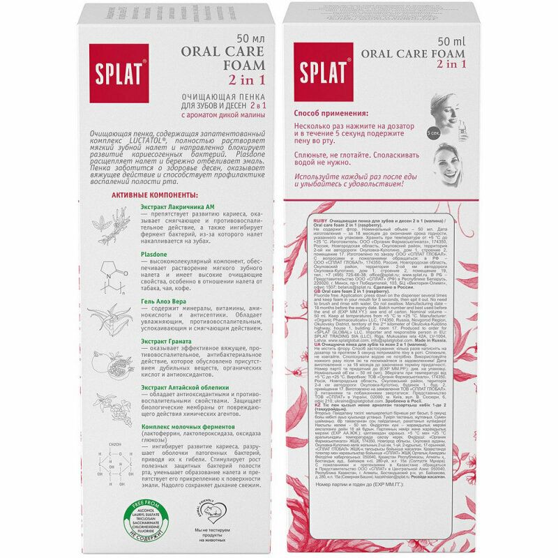 Очищающая пенка Splat Oral Care Foam для зубов и десен, 2в1, с ароматом малины, 50 мл