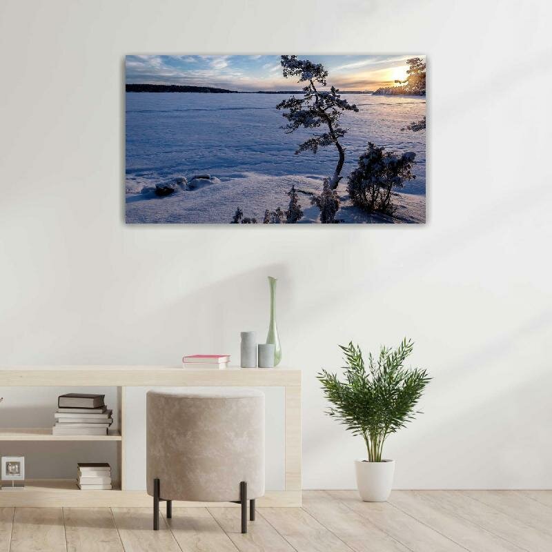 Картина на холсте 60x110 LinxOne "Пейзаж озеро снег дерево зима" интерьерная для дома / на стену / на кухню / с подрамником интересное: