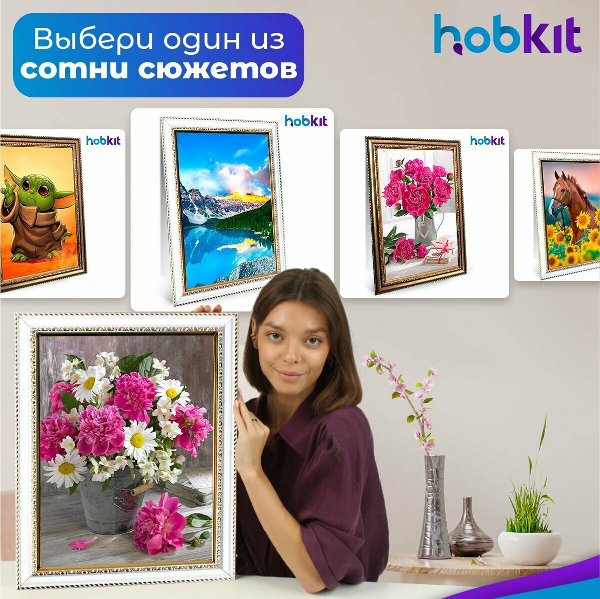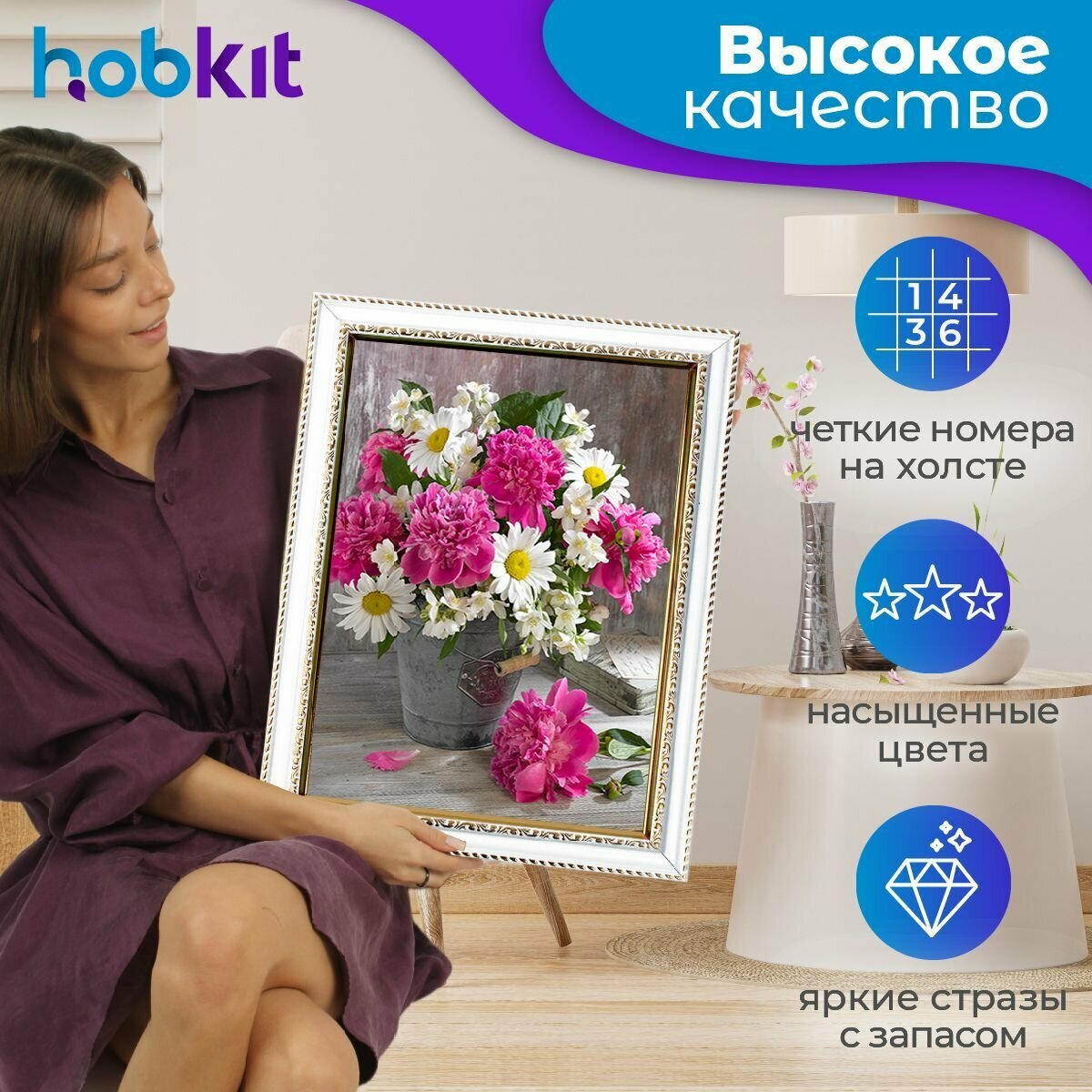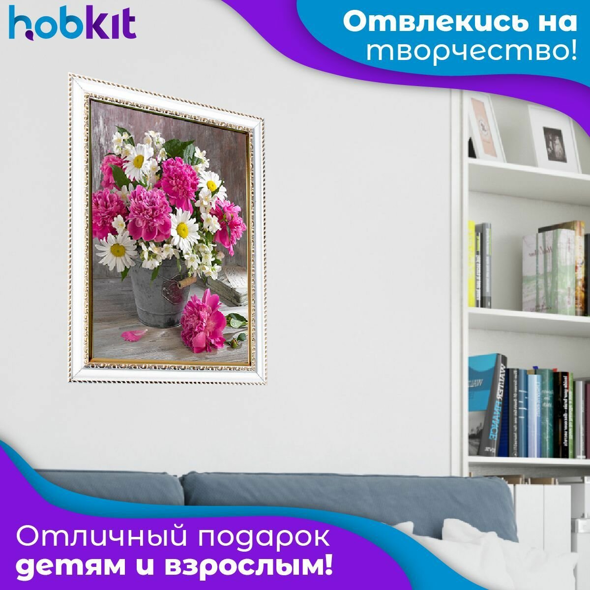Алмазная мозаика полная выкладка HOBKIT "Пионы с ромашками 40х50+Багет белый " 50х40 размер холста, интересное: