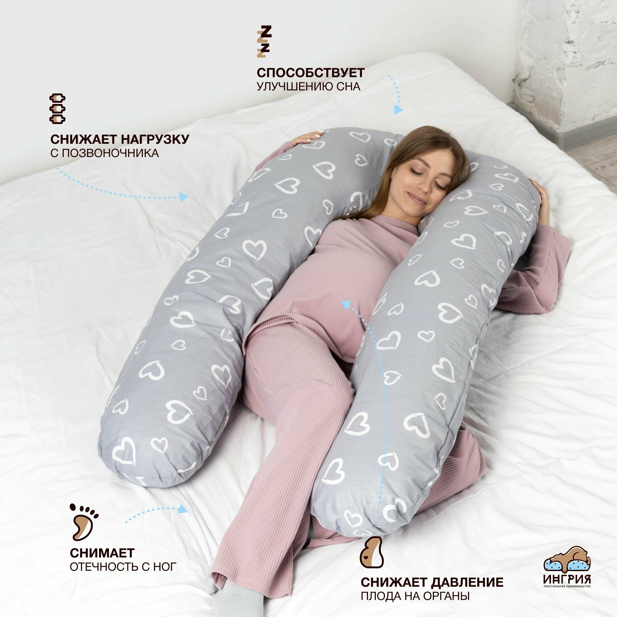 Подушка для беременных и кормящих, U-Lite, 60x130, Сердечки серая интересное: