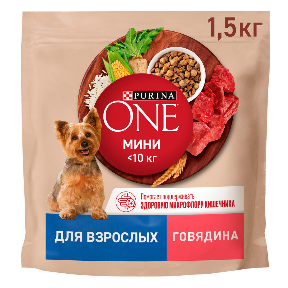 Сухой корм Purina ONE мини <10 кг для взрослых собак мелких и карликовых пород, с говядиной и с рисом, 1,5 кг