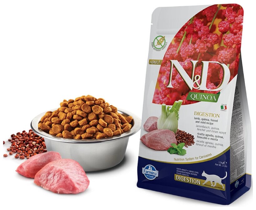 Сухой корм Farmina N&D Quinoa Digestion Lamb Adult, для взрослых кошек, беззерновой, поддержка пищеварения, ягненок, киноа,фенхель и мята,1,5 кг