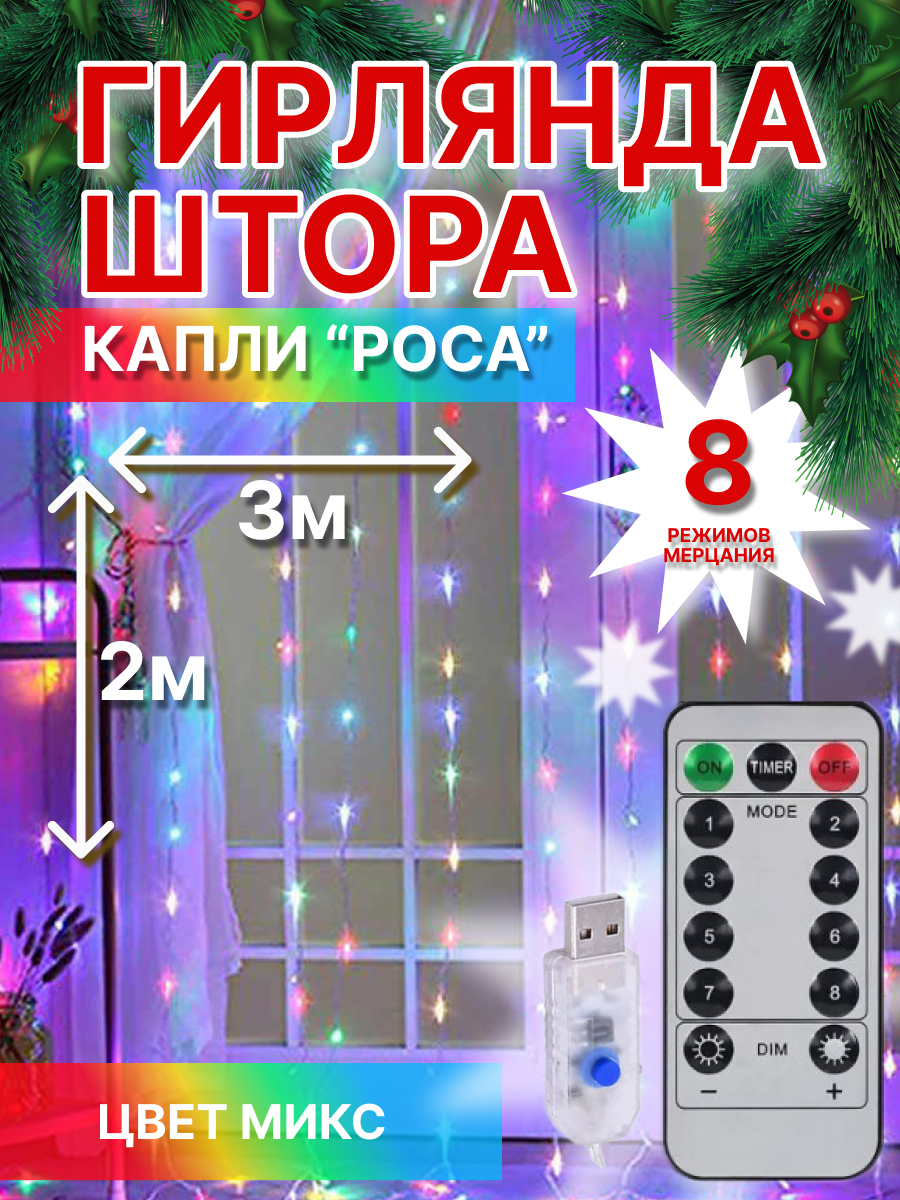 Гирлянда роса-штора 3*2м цветная USB, пульт интересное: