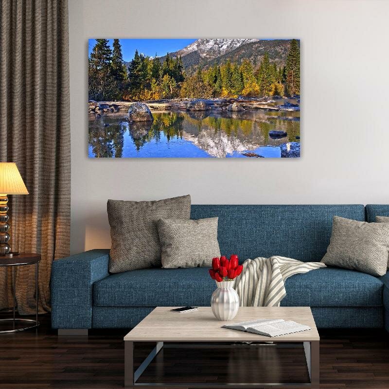 Картина на холсте 60x110 LinxOne "Небо горы озеро деревья камни" интерьерная для дома / на стену / на кухню / с подрамником интересное: