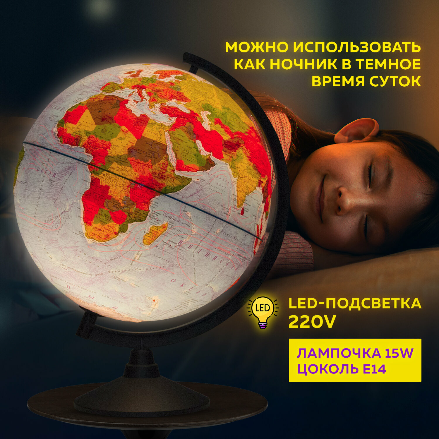 Подсветка 220 В и только при подключённом сетевом шнуре. Хорошо бы 9-12В и наличие аккумулятора, а также штекера отсоединения от глобуса сетевого шнура с блоком питания . |