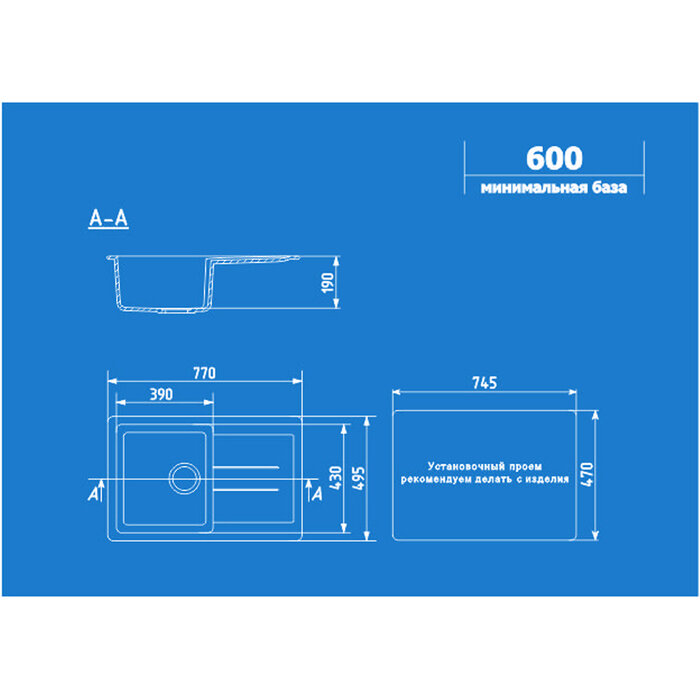 Мойка Ulgran, мрамор, U-507-308, (770*495*190 мм), черный, сифон и сливная арматура, в модуль 600