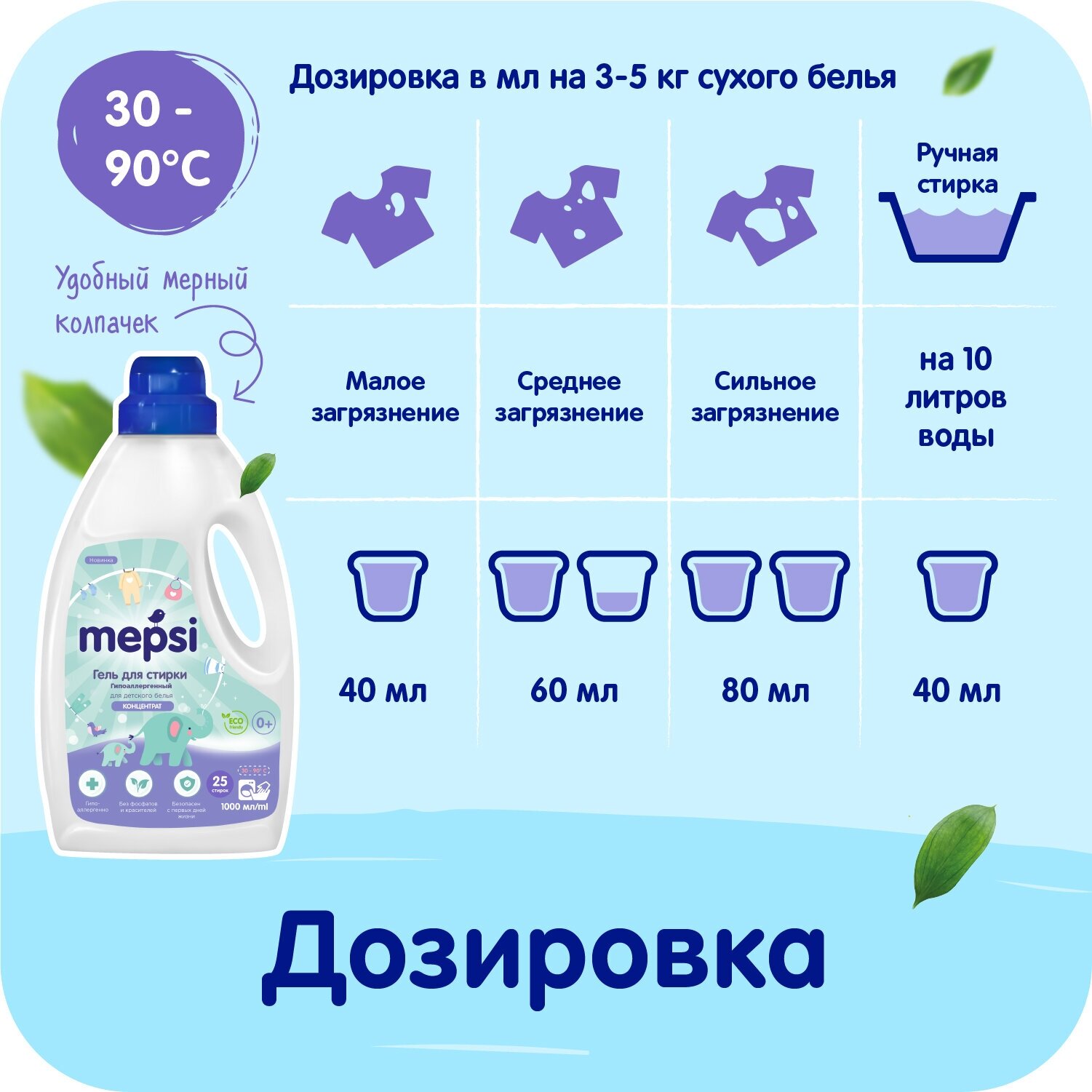 Гель для стирки на 25 стирок MEPSI белья детский 1л. 0+. Жидкий порошок для детского, черного, цветного, белого белья