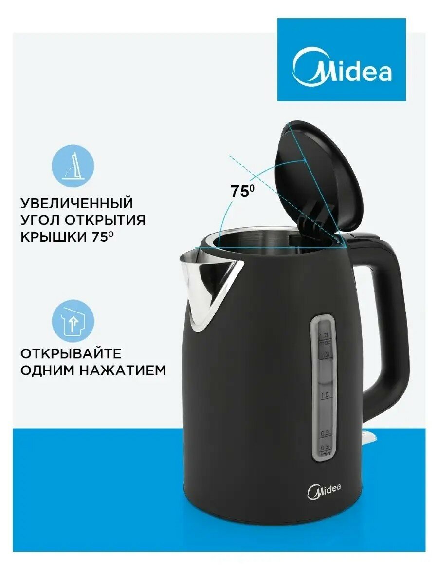 Чайник электрический Midea MK-8057, 2200 Вт, 1,7 л, Strix, индикация уровня воды, матовый черный интересное: