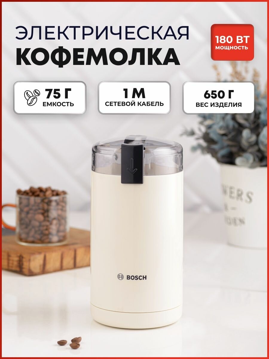 Кофемолка BOSCH TSM6A017C, мощность 180 Вт, вместимость 75 г, пластик, бежевая