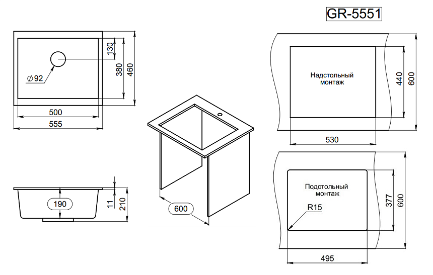 Мойка кухонная кварцевая Granula GR-5551 555x460 мм черный
