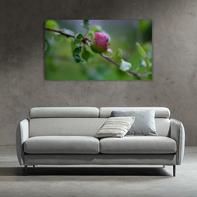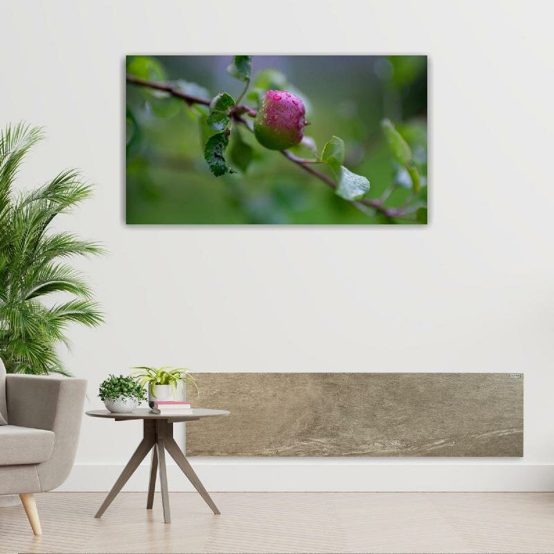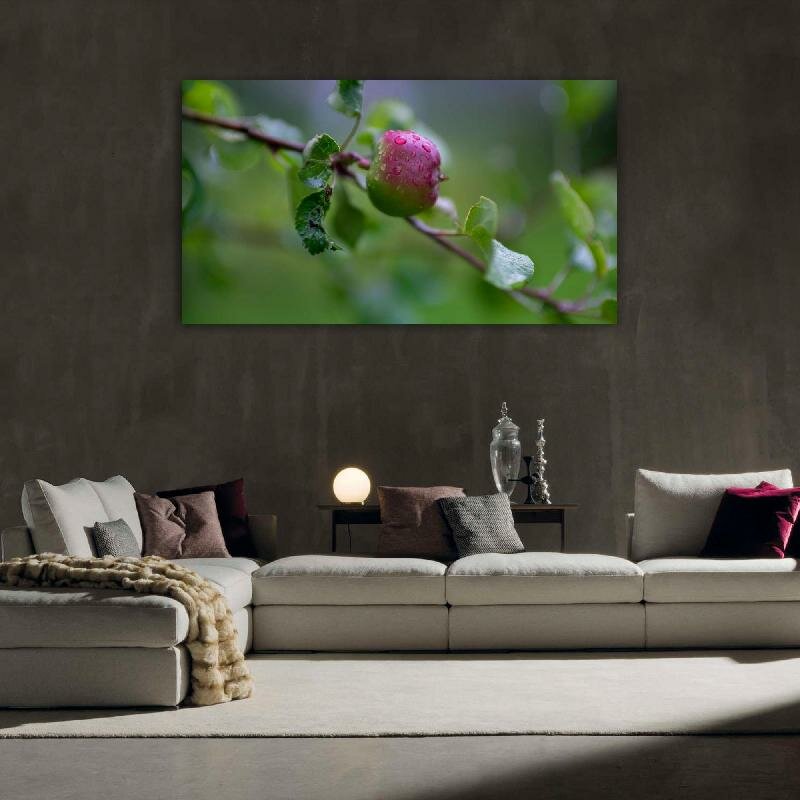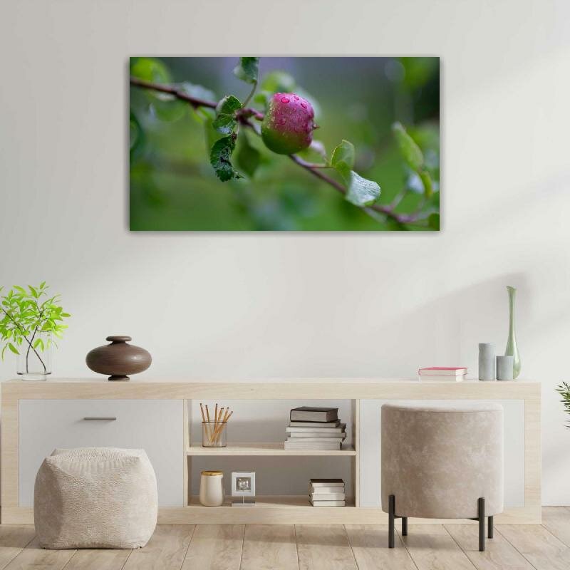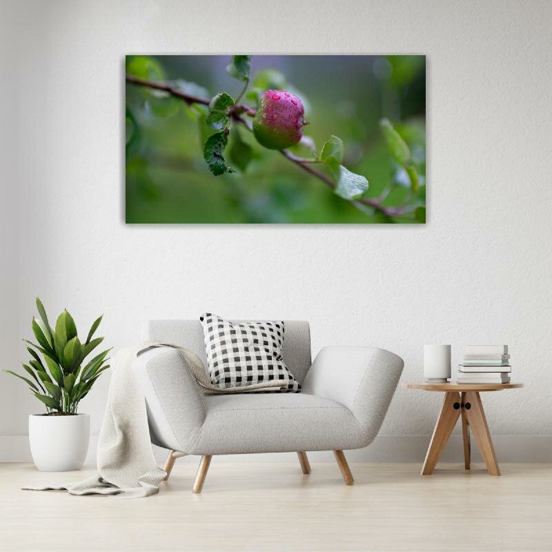 Картина на холсте 60x110 LinxOne "Листья капли яблоня ветка боке" интерьерная для дома / на стену / на кухню / с подрамником интересное: