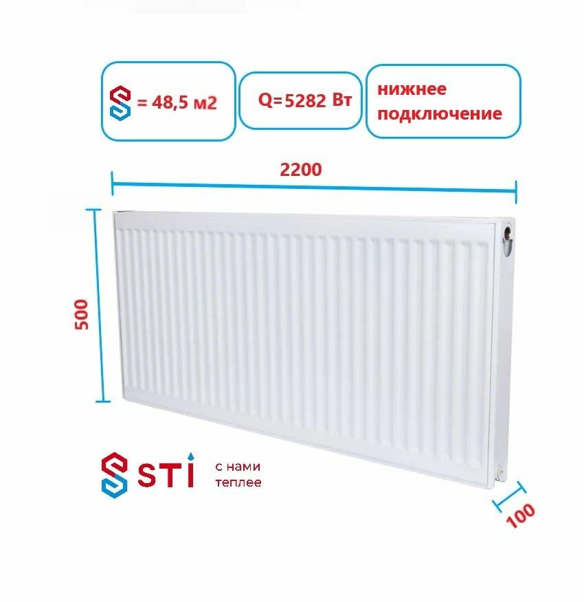 Радиатор стальной панельный ROMMER Ventil 22/500/1000 нижнее правое подключение (RRS-2020-225100)