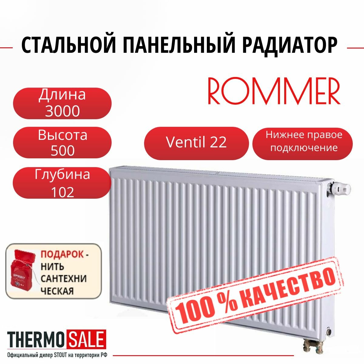 Радиатор стальной панельный ROMMER 500х1200 нижнее правое подключение Ventil 22/500/1200 Нить сантехническая