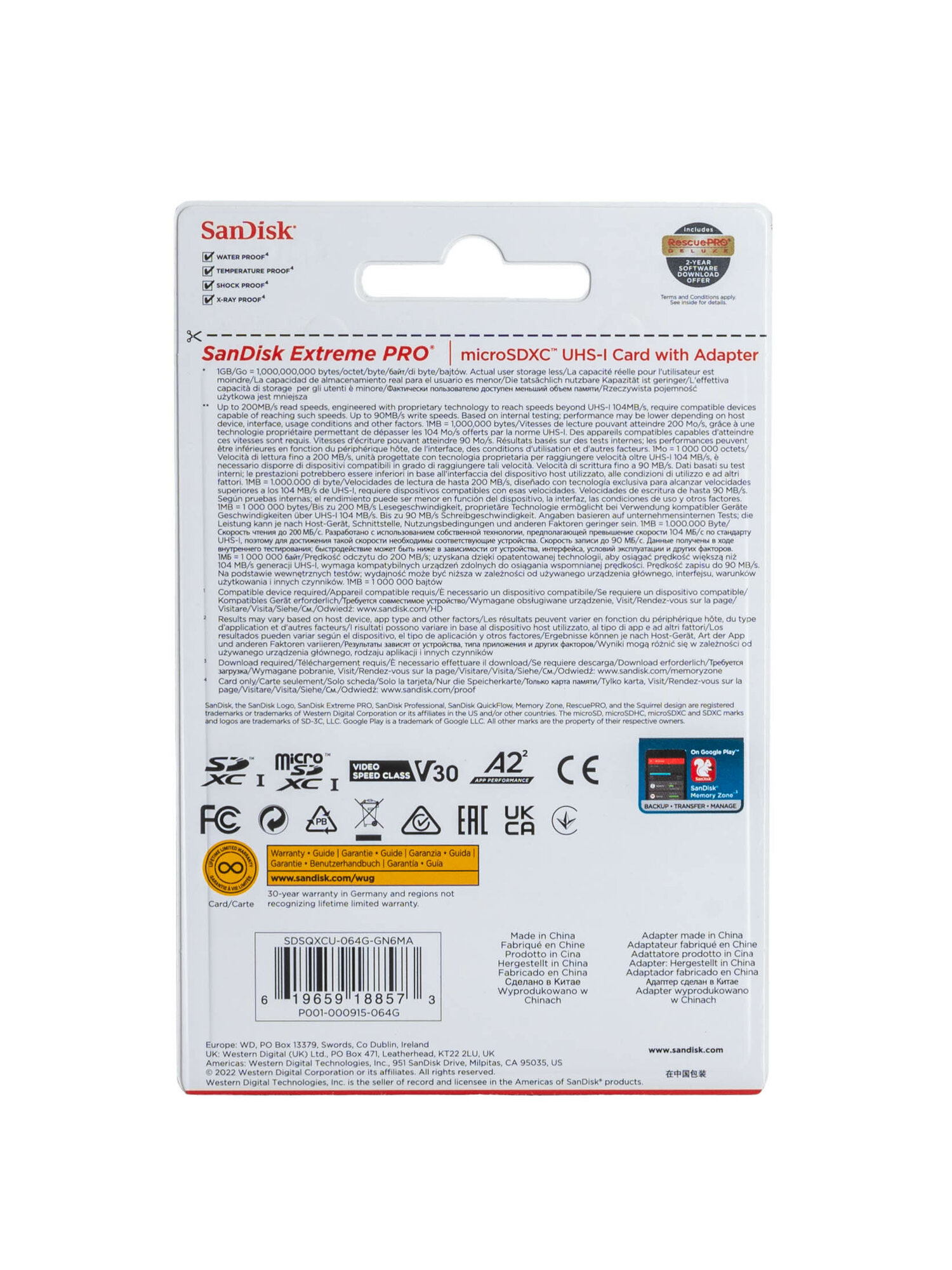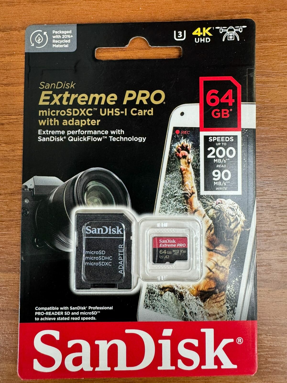Карта памяти SanDisk Extreme PRO microSDXC 64 ГБ Class 10 UHS-I U3, V30, A2 (R/W 200/90 Mb/s) + SD адаптер