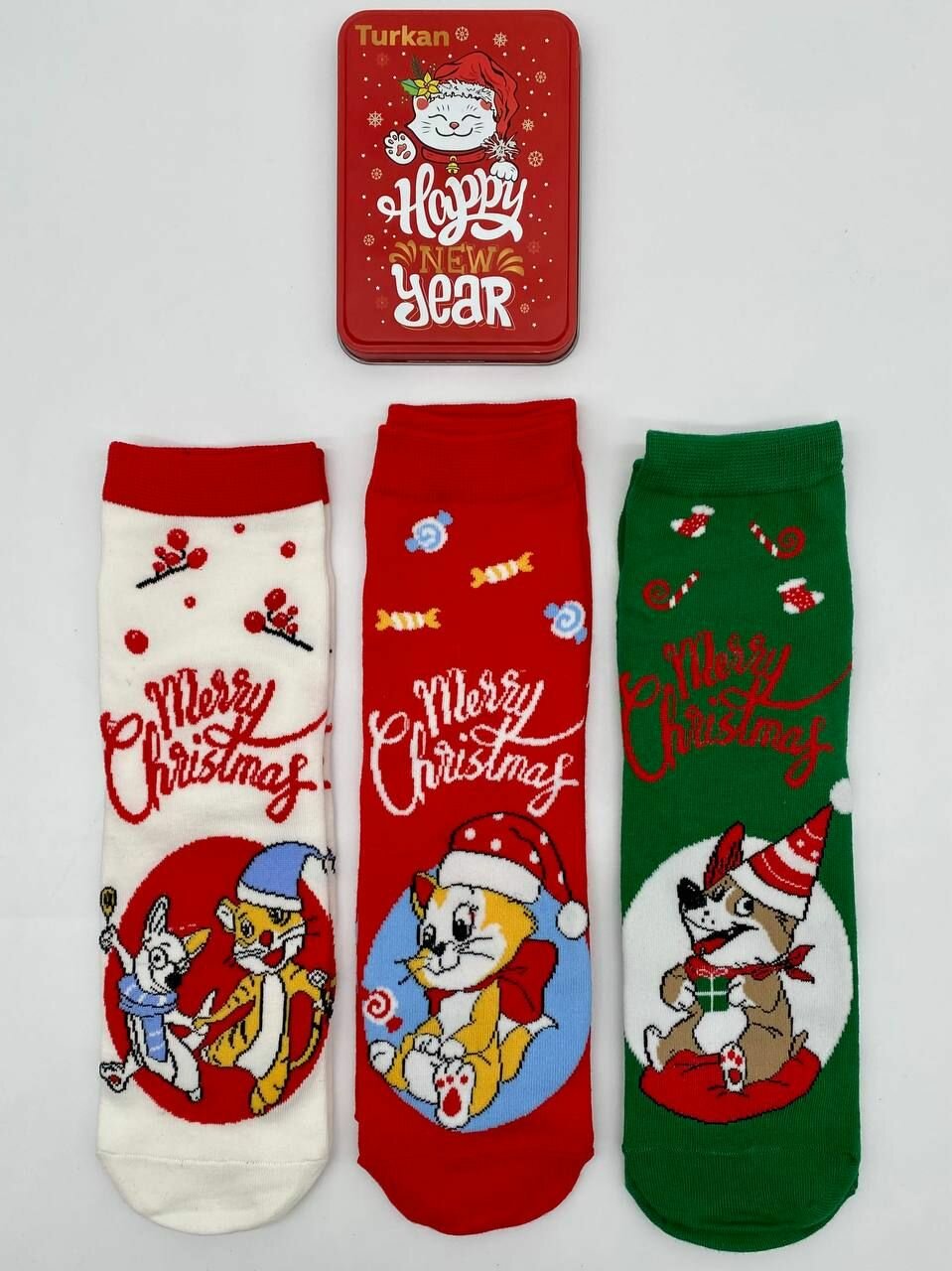 Купить Новогодние носки подарочный набор с принтом 3 пары Котенок