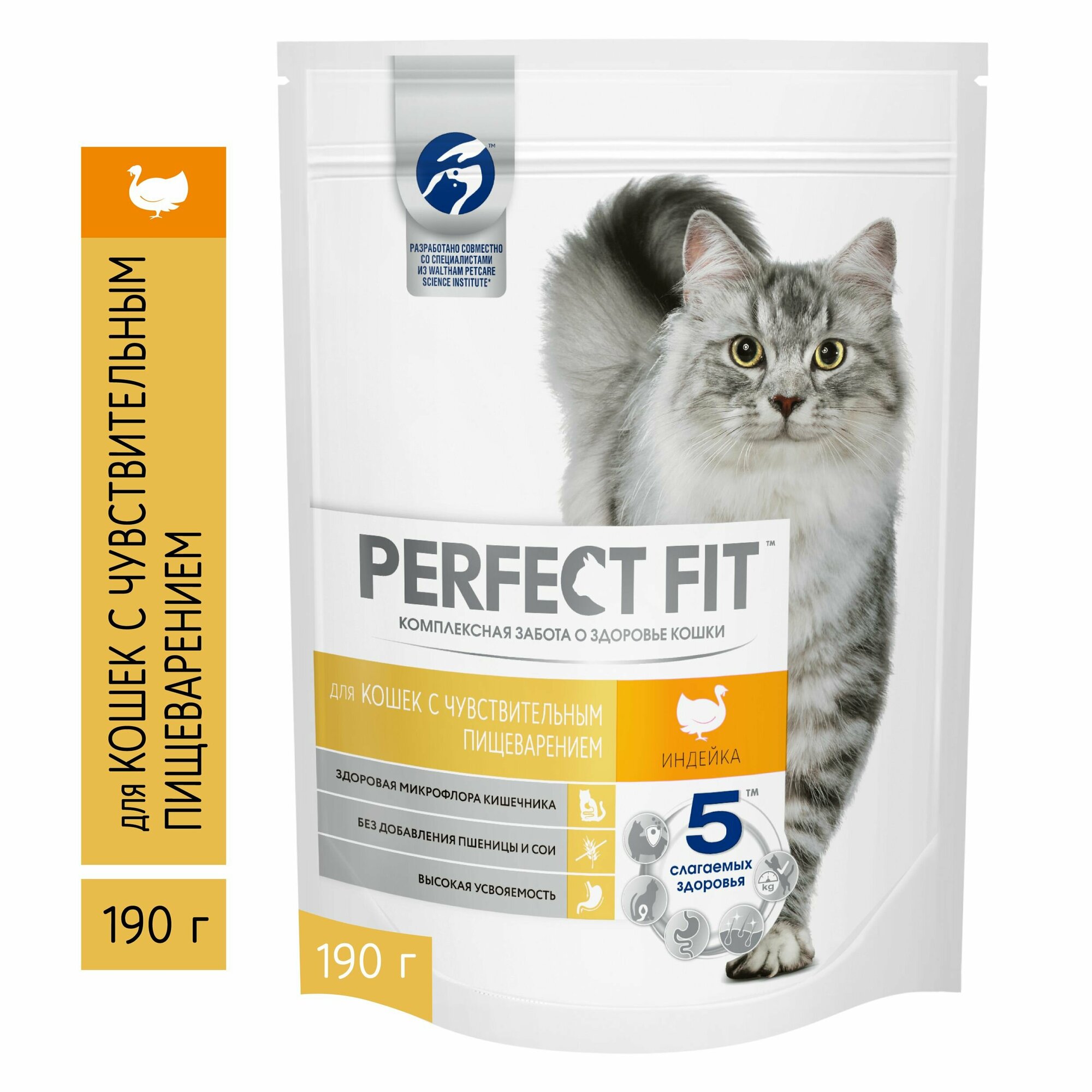 Корм сухой Perfect Fit для взрослых кошек с чувствительным пищеварением с индейкой, 190г - 4 шт