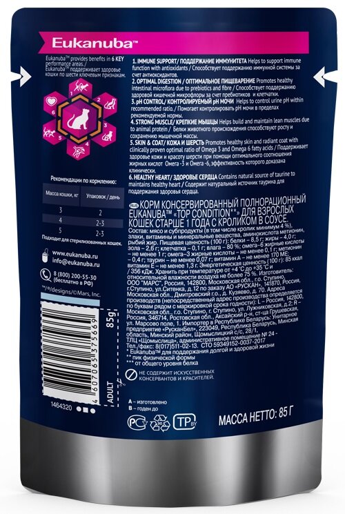 Влажный корм для кошек Eukanuba Top Condition Adult 1+ years, для здоровья кожи и блеска шерсти, с кроликом, 85 г (кусочки в соусе)