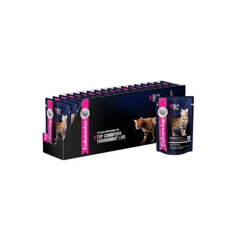 Влажный корм для кошек Eukanuba Top Condition Adult 1+ years, для здоровья кожи и блеска шерсти, с кроликом, 34 шт. х 85 г (кусочки в соусе)