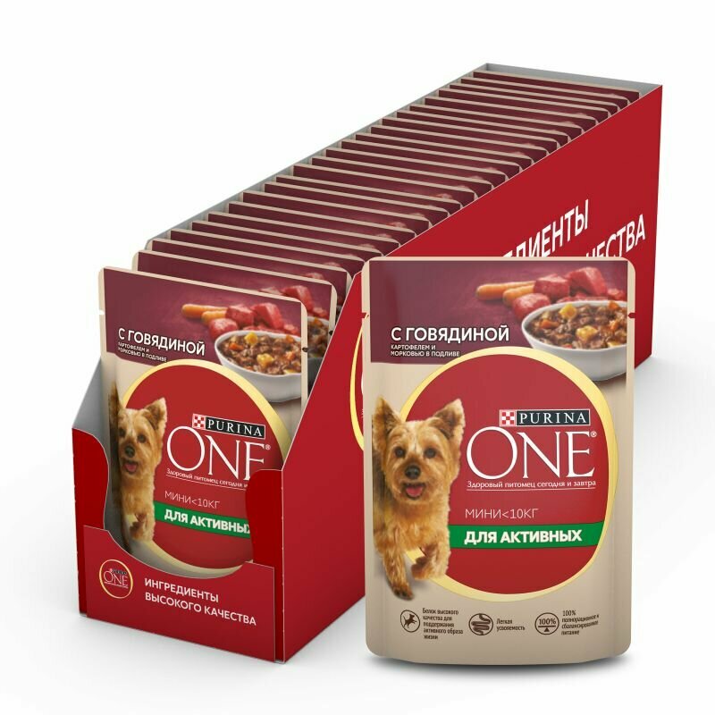 Влажный корм Purina ONE мини для активных, для собак мелких пород, с говядиной, картофелем и морковью в подливе, пауч, 26х85 г
