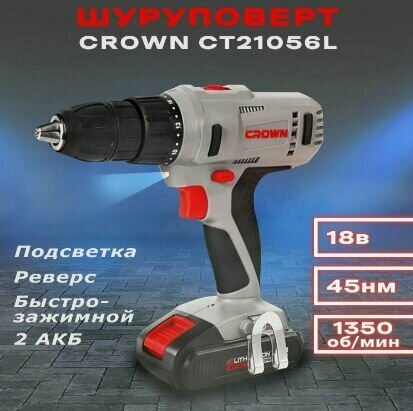 Дрель-шуруповерт аккумуляторная CROWN CT21056L-1,5 BMC (18В, 2акк*1,5Ah LiIon, 45Нм, 350/0-1350об/мин, 1,54кг, кейс)
