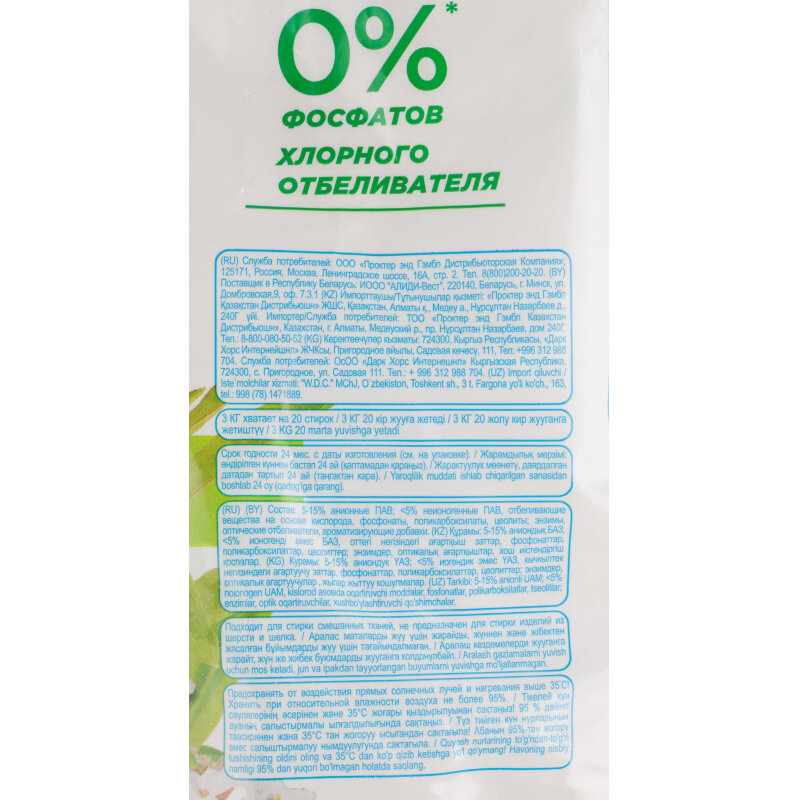 | Отзыв: | Большая, экономичная пачка. При стирке 40 градусов кладу немного порошка. Он полностью растворяется, отлично пенится и хорошо отстирывает бельё. На одежде следов не оставляет, полностью смывается. После стирки вещи ещё долго приятно пахнут. Очень выгодно и практично |