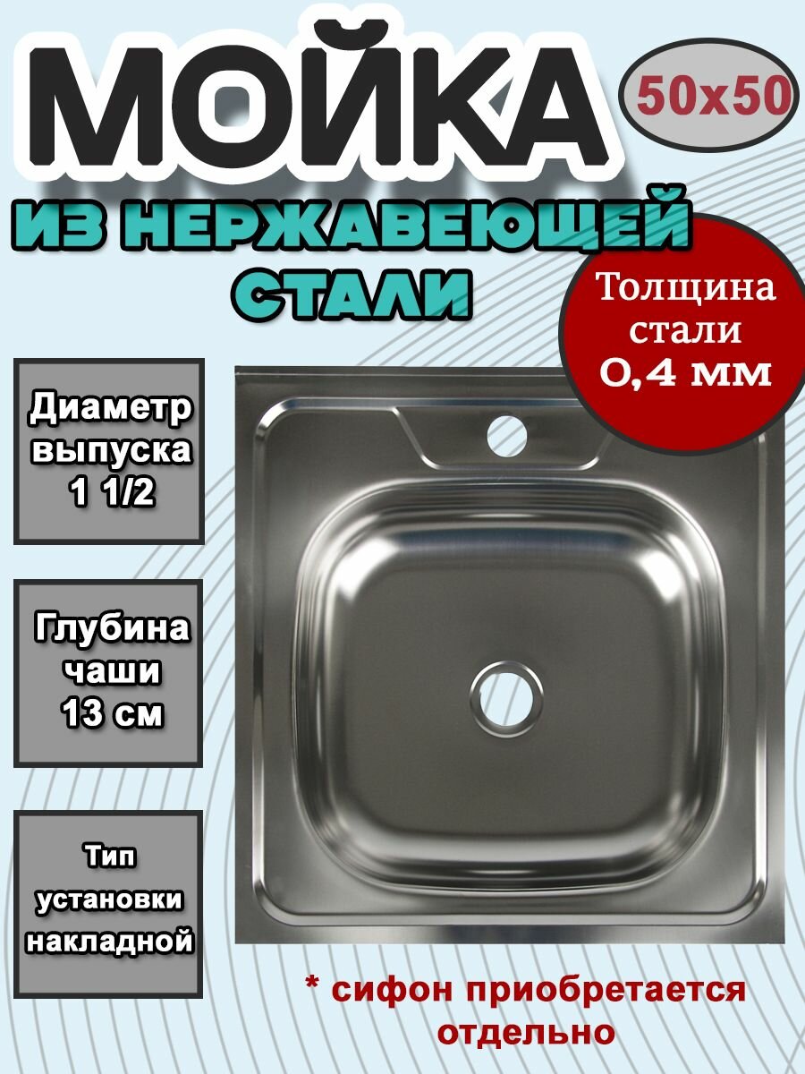 Мойка для кухни накладная 50х50 см, нержавеющая сталь, выпуск 1 1/2, толщина стали 0,4 мм