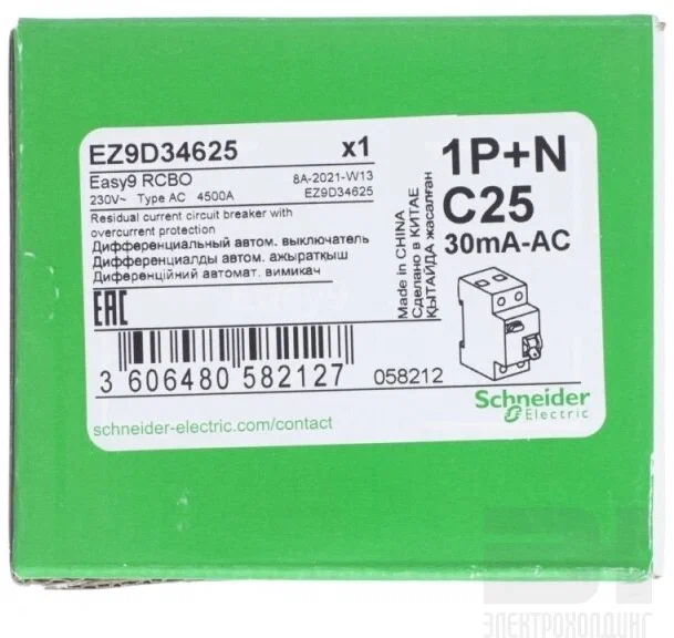Schneider Electric EASY 9 Дифференциальный автоматический выключатель 1P+Н 25А 30мА C AC EZ9D34625
