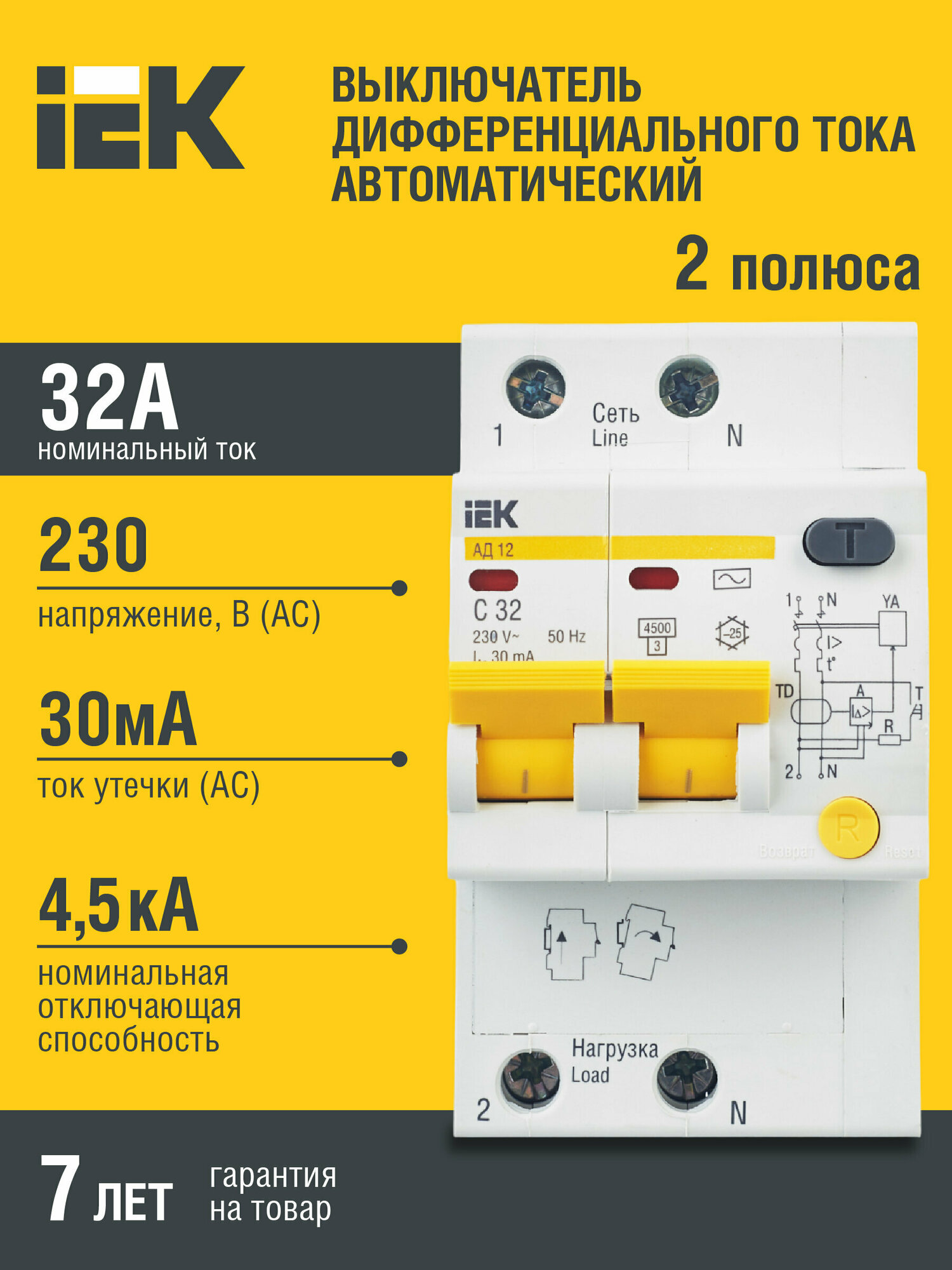 Дифференциальный автомат IEK АД12 2П 30 мА C 4.5 кА AC электронный 32 А