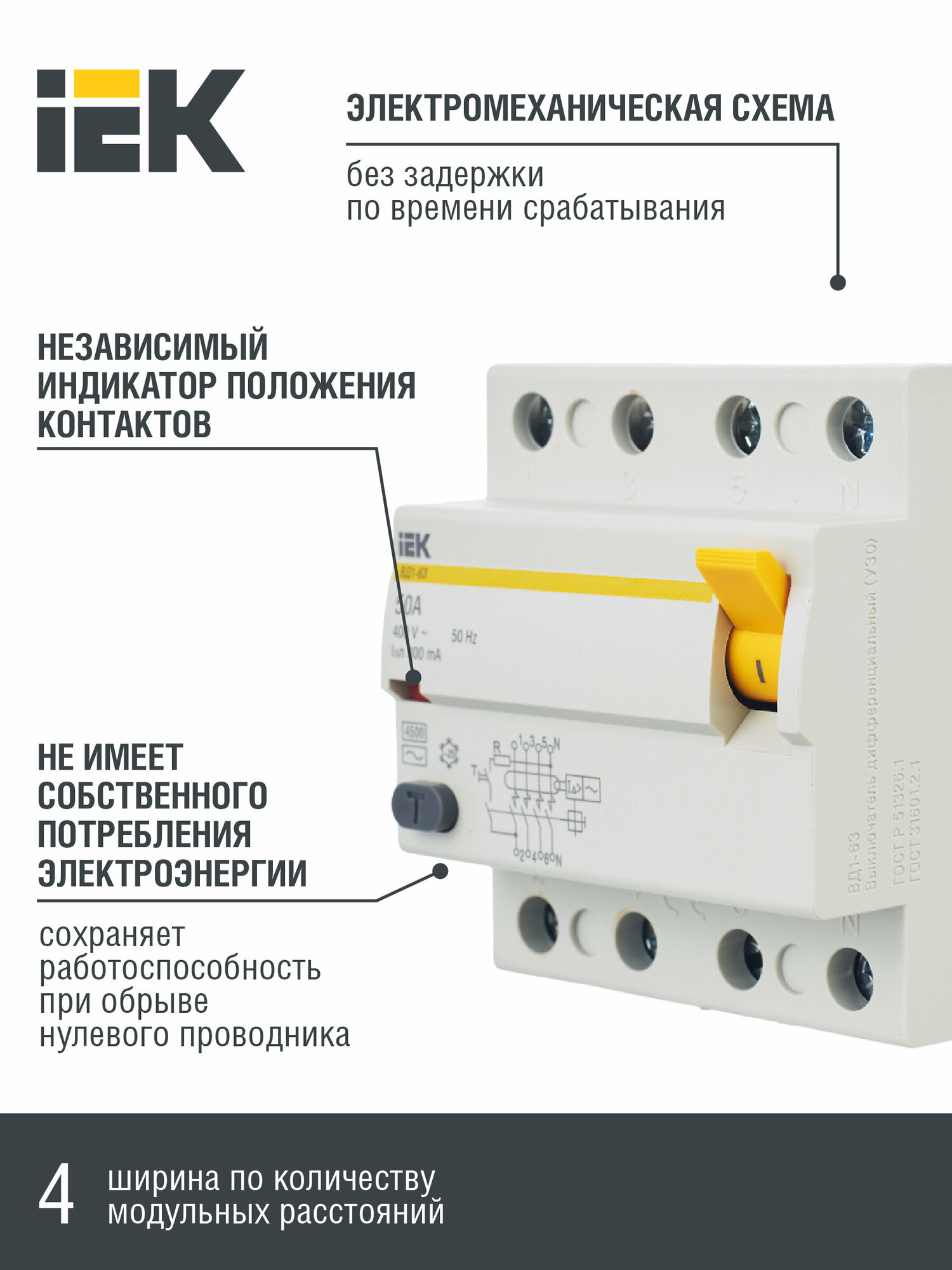 Выключатель дифференциального тока (УЗО) ВД1-63 4п 50А 300мА АС(Электромеханическое) | код MDV10-4-050-300 | IEK ( 1шт )