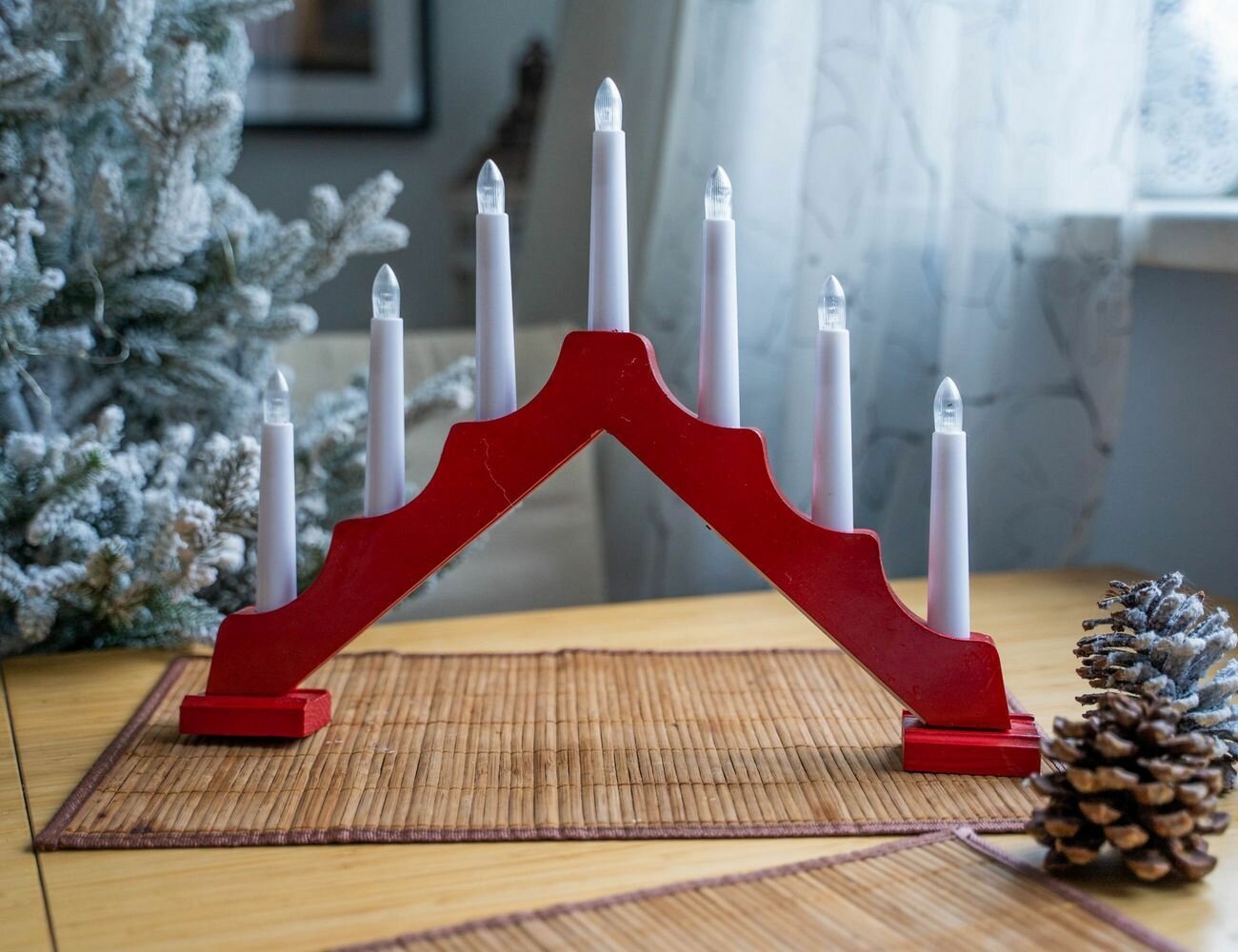 Свечи на красной деревянной подставке - горке, 7 ламп - свечек, 39х30 см, батарейки, SNOWHOUSE BIE1307 интересное: