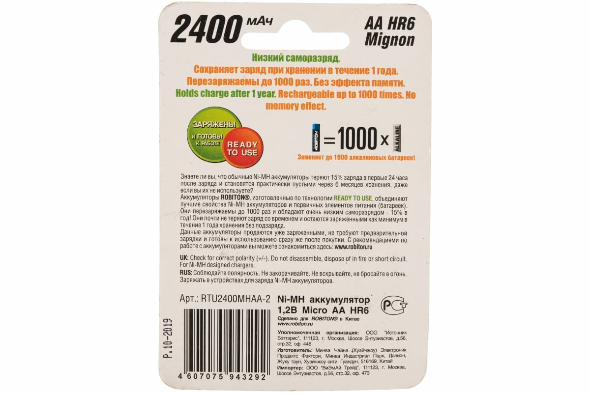 Аккумулятор Ni-Mh 2400 мА·ч 1.2 В ROBITON AA R6 Mignon 2400, в упаковке: 2 шт. интересное: