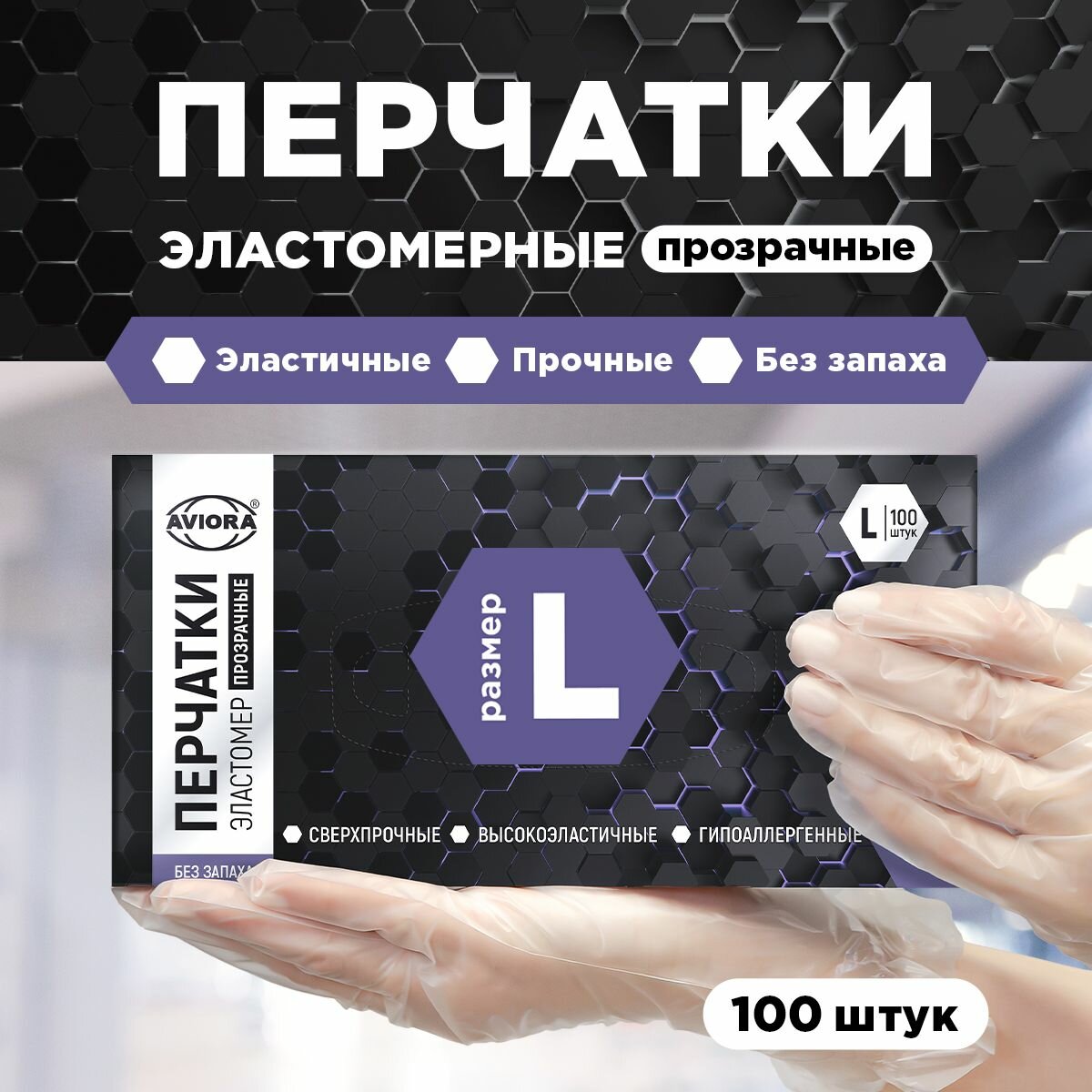 Перчатки одноразовые, эластомер, размер L, 100 шт. в уп., AVIORA