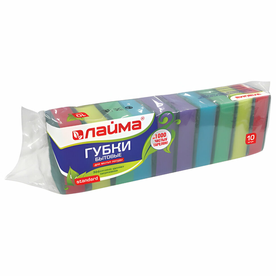 Губки бытовые STANDART, 26х80х53 мм, комплект 10 шт., поролон/абразив для посуды/уборки, LAIMA, К002, 601551