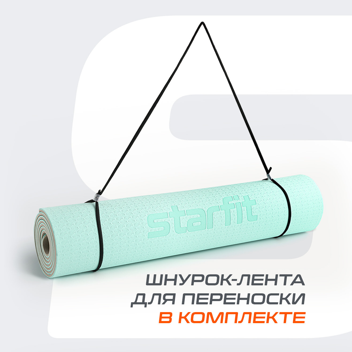 Коврик для йоги и фитнеса STARFIT FM-201, TPE, 183x61x0,4 см, мятный/синий с шнурком для переноски