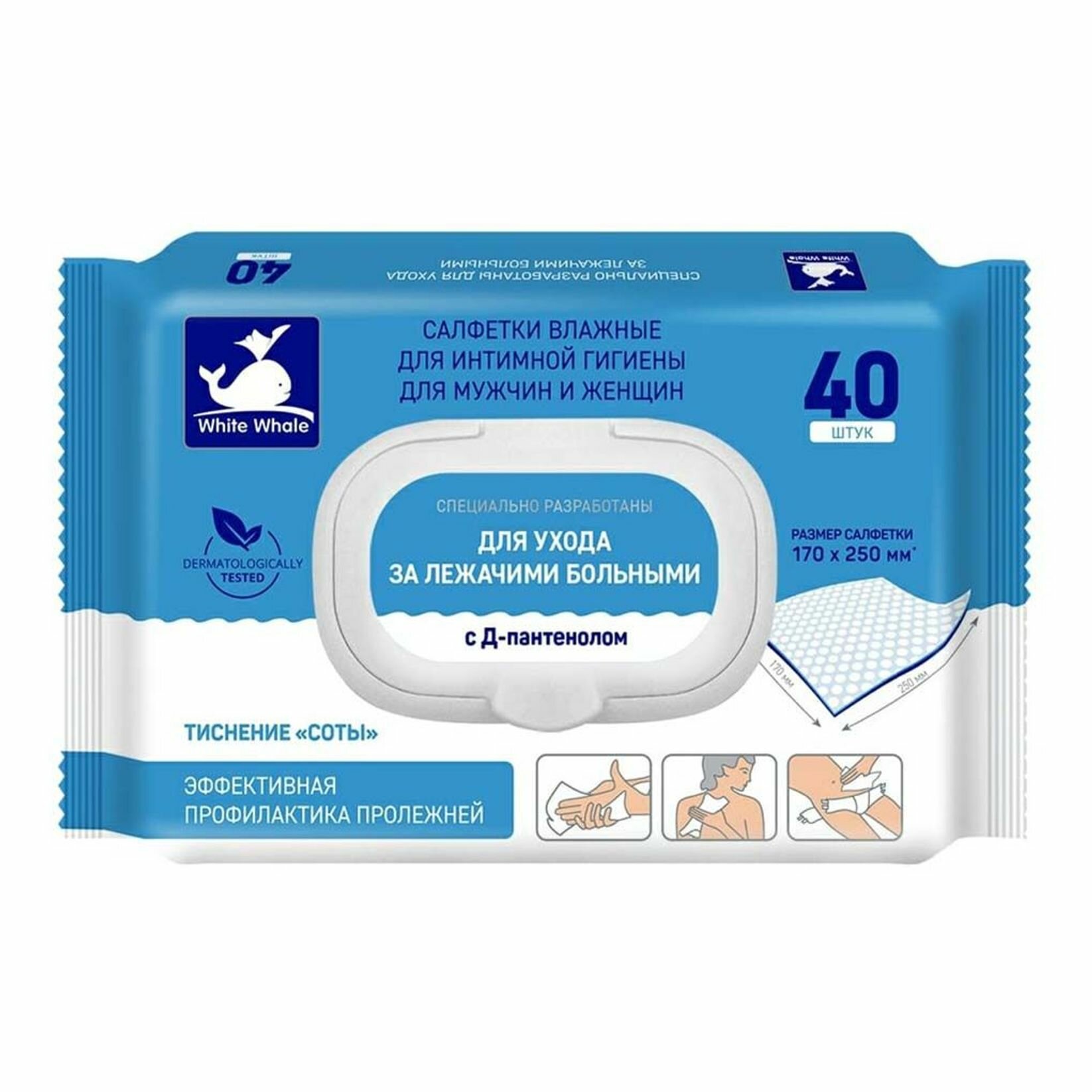 Салфетки влажные для ухода за лежачими больными "White Whale" с экстрактом каланхое и Д-пантенолом, 17х25 см, 2 уп. по 40 шт.